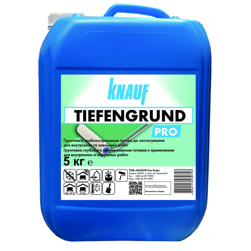 Грунтовка Кнауф Тіфенгрунд повністю готова до застосування. Вона використовується для внутрішніх і зовнішніх робіт. Грунтовка проникає глибоко в структуру основи, регулює його поглинаючу здатність і збільшує адгезію з подальшим оздоблювальним шаром. Крім того, обробка грунту складом дозволяє зміцнити поверхню і зв'язати будівельний пил. Нанесений шар швидко сохне і не має неприємного запаху. Може використовуватися в житлових і громадських приміщеннях.